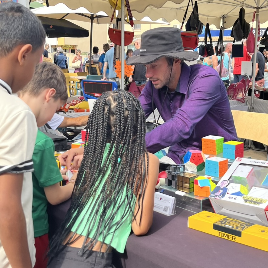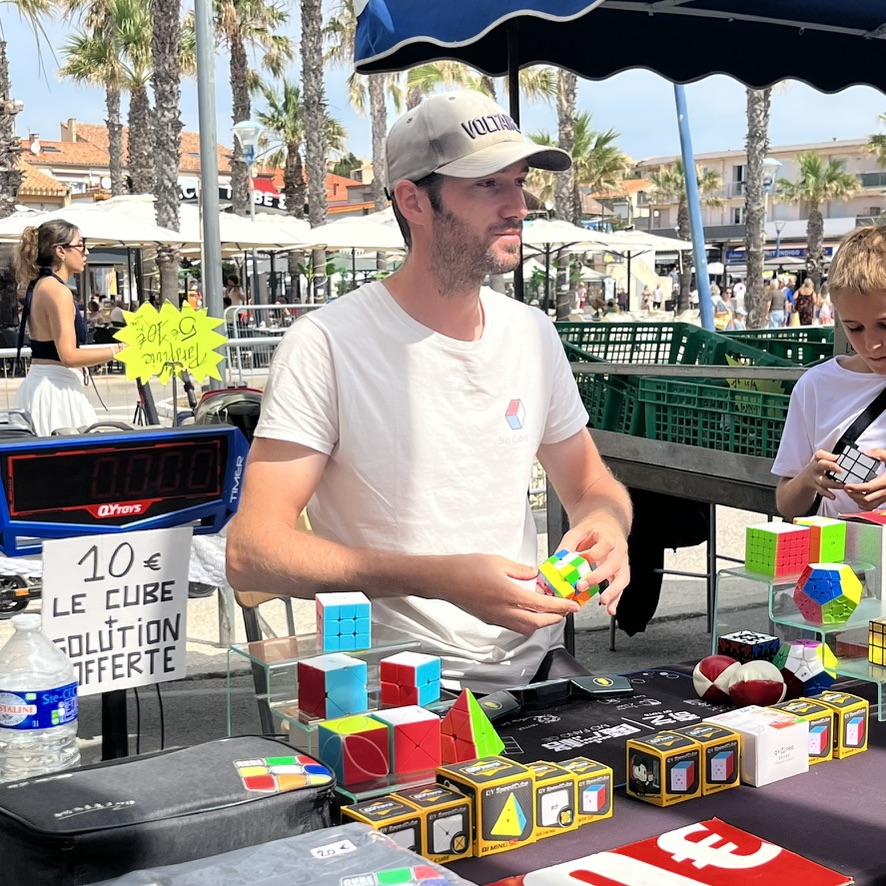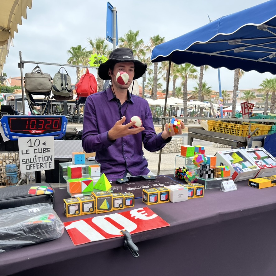 Find the stand from July 1st to August 31st every morning on the market of Saint-Pierre-la-Mer, and every evening on the market of Narbonne-Plage. Demonstration, initiation, and sale of high-end speedcubes!